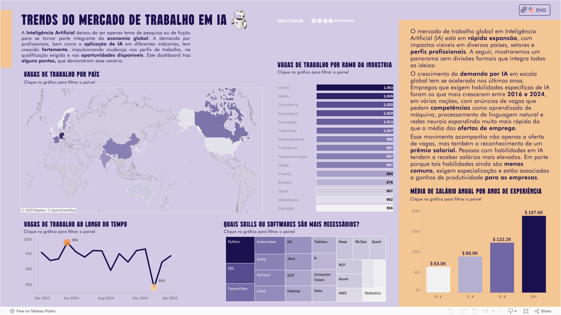 Artificial Intelligence is no longer just a topic of research or fiction, but has become an integral part of the global economy. The demand for professionals, as well as the application of AI in various industries, has grown significantly, driving changes in job profiles, required qualifications, and available opportunities. This dashboard highlights some points that demonstrate this scenario.